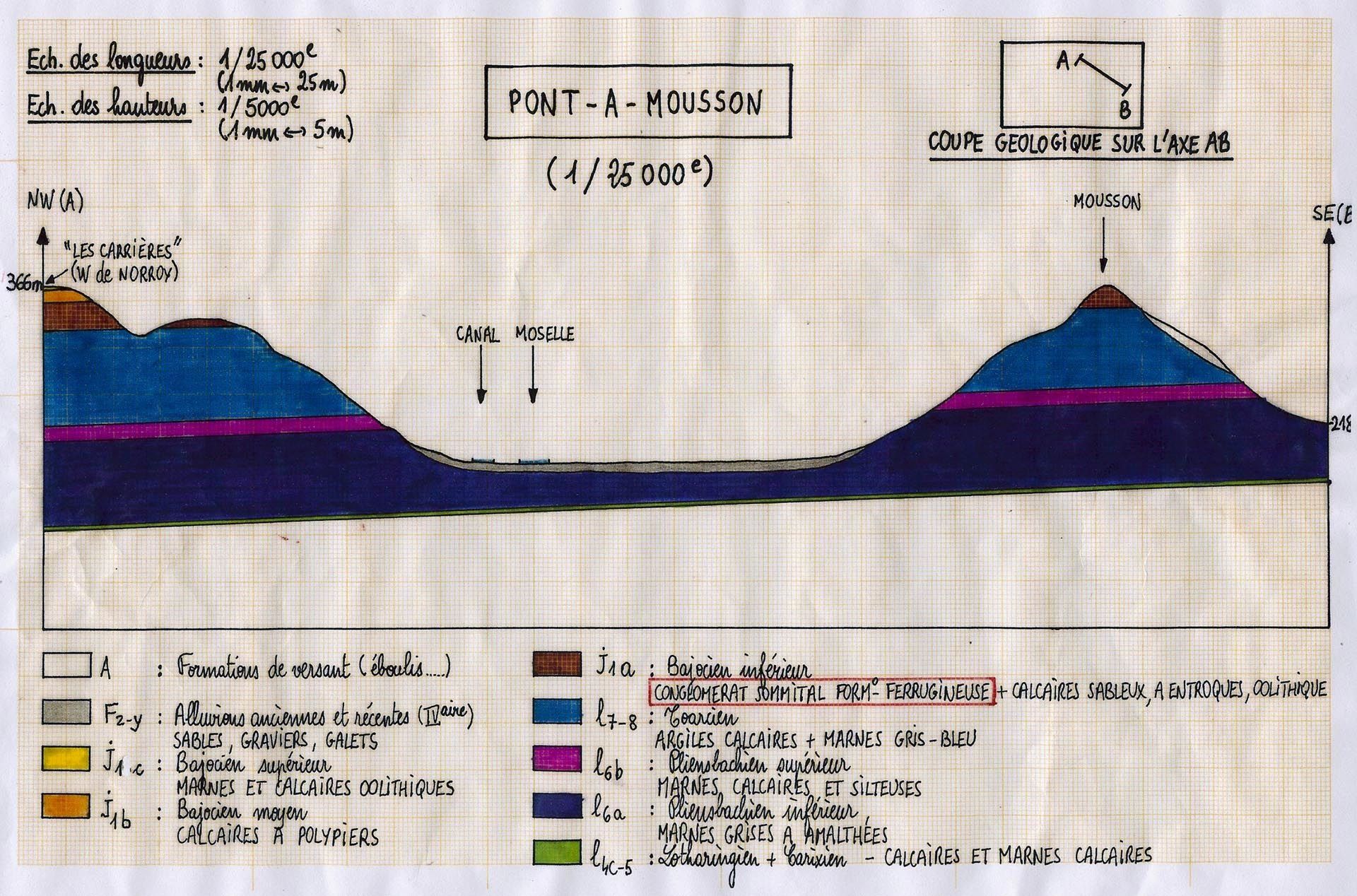 Les hauteurs des Côtes de Moselle, des buttes de Mousson et du Xon, de Bouxières-Sous-Froidmont ou encore d’Arry sont constituées de cette roche jaune. L’observation de l’affleurement montre la présence de stratifications, c’est-à-dire de dépôts successifs de sédiments : c’est une roche sédimentaire. Il en est de même au pied de notre butte pour la roche grise extraite du site d’enfouissement : c’est aussi une roche sédimentaire.